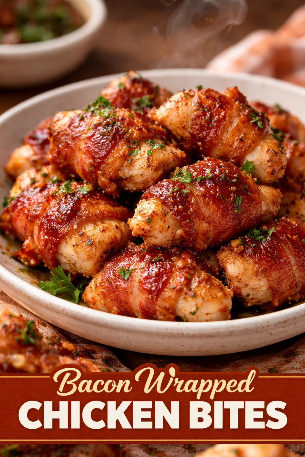 Serve these Bacon Wrapped Chicken Bites warm on a wooden board with toothpicks and little bowls of dipping sauces — honey mustard, barbecue, or a smoky aioli. Picture a chilly evening with friends, laughter spilling over, a platter of these on the coffee table, and a crisp salad or roasted sweet potatoes beside them. They make a comforting food main course with roasted vegetables, or an indulgent appetizer at holiday parties. For a cozy family dinner, pair with creamy mashed potatoes and steamed green beans for the ultimate family favorite plate.