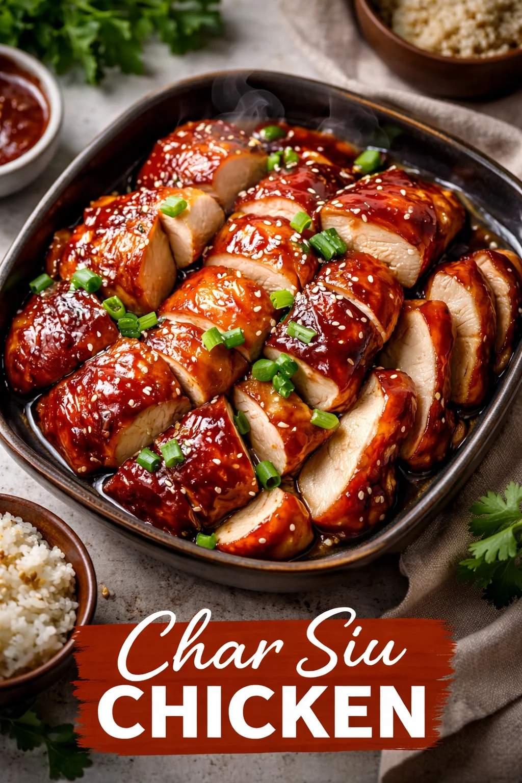 Serve sliced Char Siu Chicken over steaming jasmine rice or coconut rice, with quick pickled cucumbers and scallions. For a lighter plate, toss it over a crisp Asian slaw with toasted sesame seeds. This dish sings with simple sides—steamed broccoli, garlic green beans, or an egg fried rice for a cozy family dinner. If you want a sweet-savory pairing, a warm pear or lychee dessert is lovely. For another chicken pairing idea, a maple-glazed profile works well, similar in spirit to air-fryer maple-glazed chicken breast.