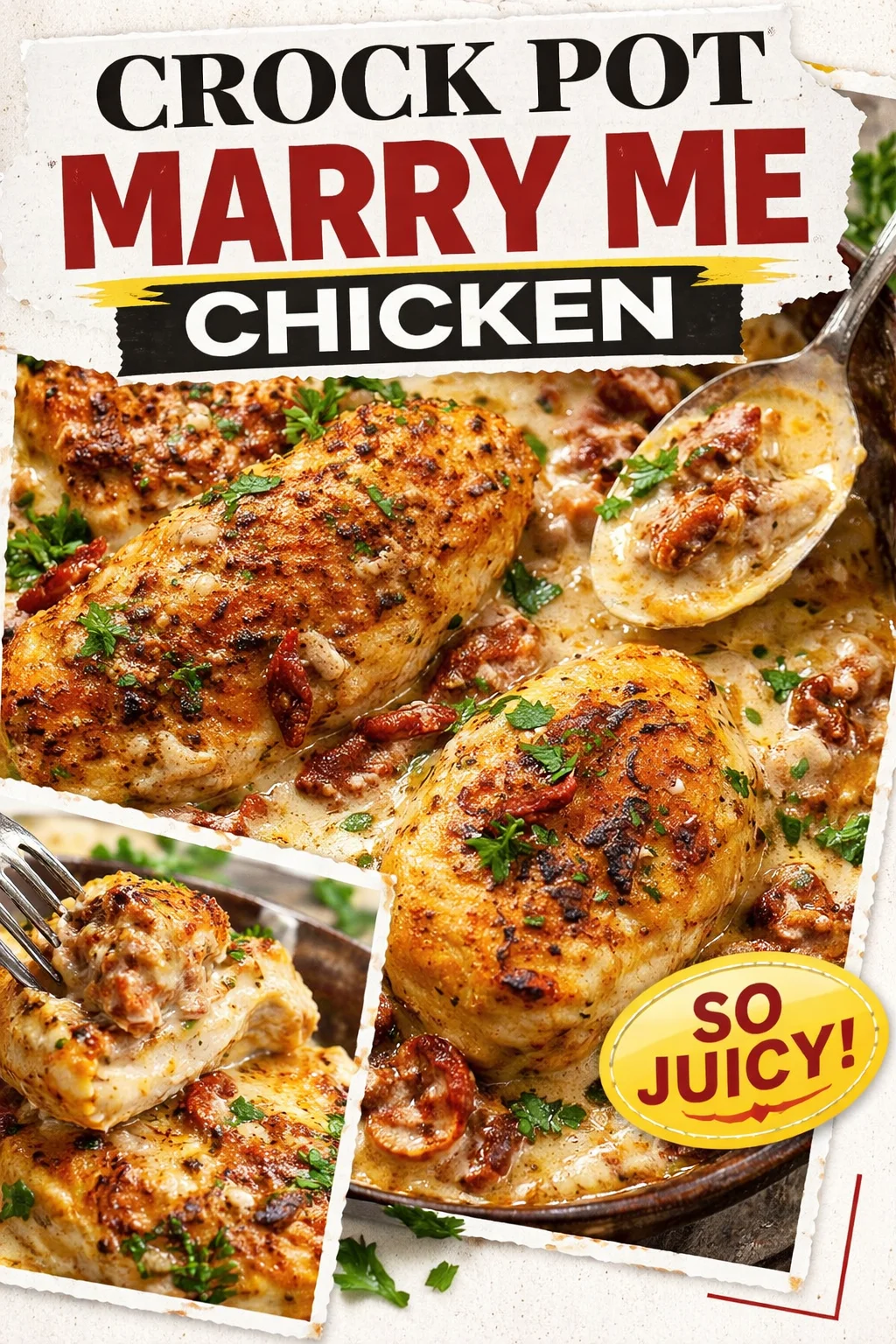 There is a quiet magic to meals that bring people together, and Crock Pot Marry Me Chicken is one of those recipes that turns ordinary nights into memories. It is comforting food that feels indulgent yet effortless, an easy recipe to tuck into your weeknight rotation or serve at a small celebration. Try it, make it yours with a twist, and share it—the best recipes are the ones that become part of our stories. If you try this, I would love to hear how it filled your home with warmth and good conversation.