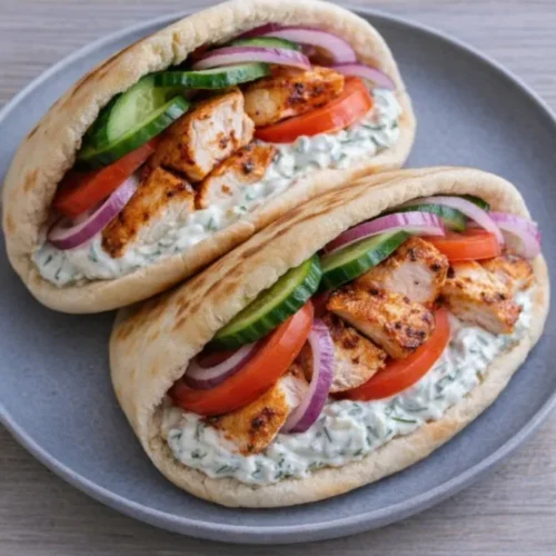 A flavorful and comforting meal featuring tender chicken seasoned with Mediterranean spices, served in warm pita with homemade tzatziki.