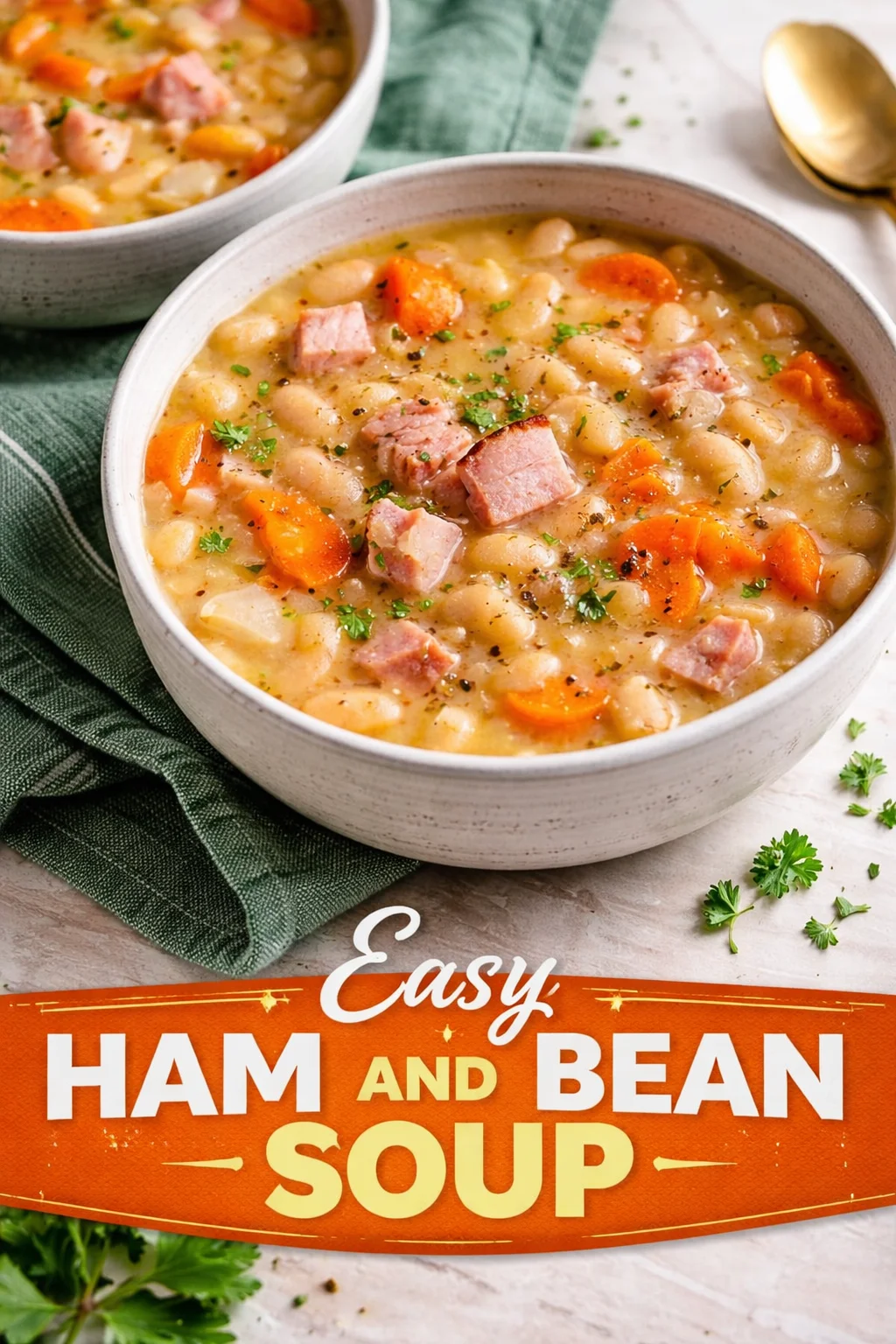 Pair this Easy Ham and Bean Soup with crusty bread for dipping, a crisp green salad to cut the richness, and a glass of crisp cider or a warm spiced tea. Imagine bowls placed on a well-worn kitchen table, steam rising, laughter around you — this is the kind of meal that turns ordinary evenings into memorable ones. Serve it on chilly nights, family gatherings, or even as the centerpiece of a relaxed holiday lunch.