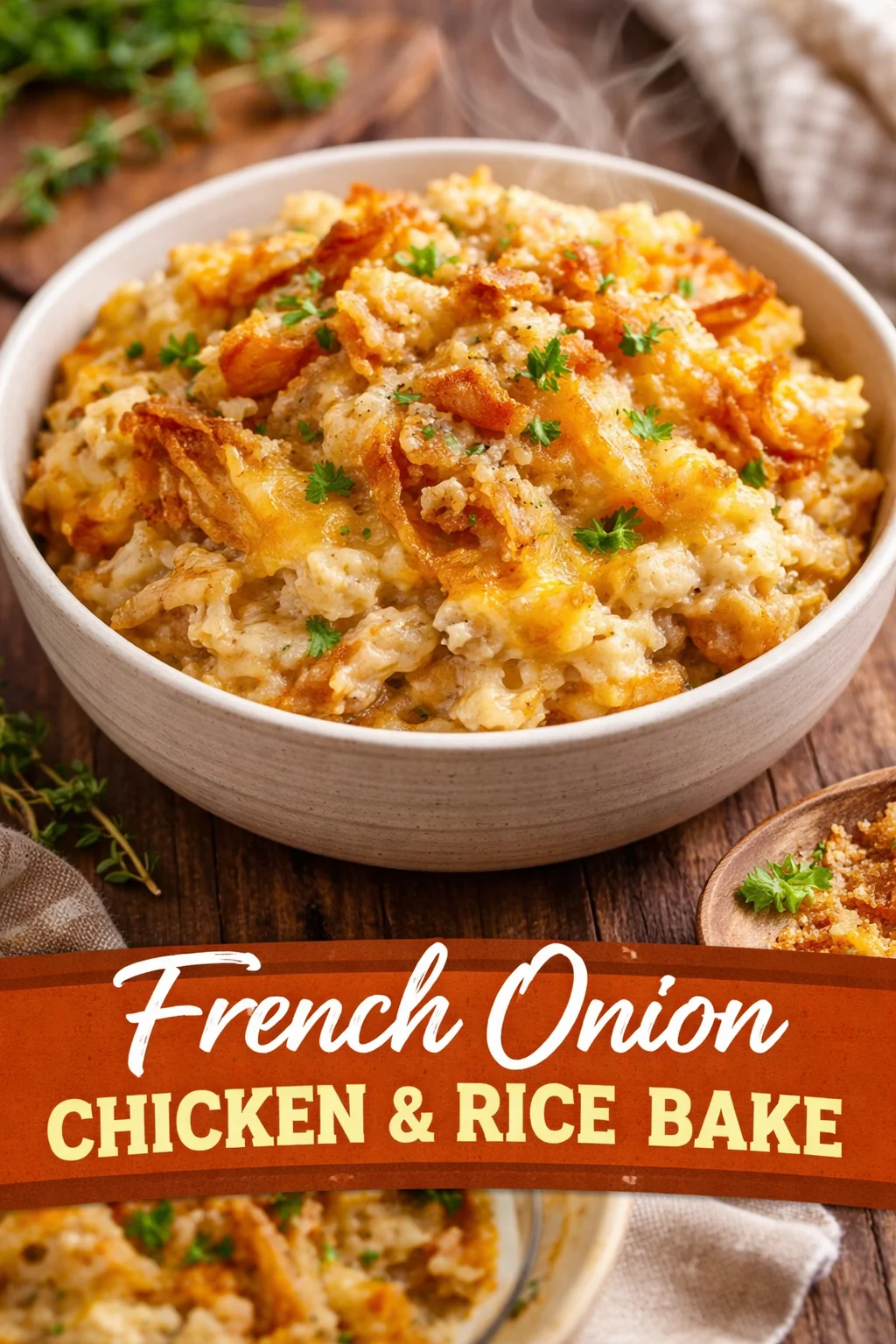 Serve this French Onion Chicken and Rice Bake with a crisp green salad dressed with lemon vinaigrette to cut through the richness, or roasted root vegetables for a hearty plate. A crisp white wine or a light-bodied red pairs beautifully — imagine spooning up a warm, cheesy bite while laughter fills the room. It’s perfect for family nights, casual dinner parties, and makes a lovely take-to-a-friend meal.