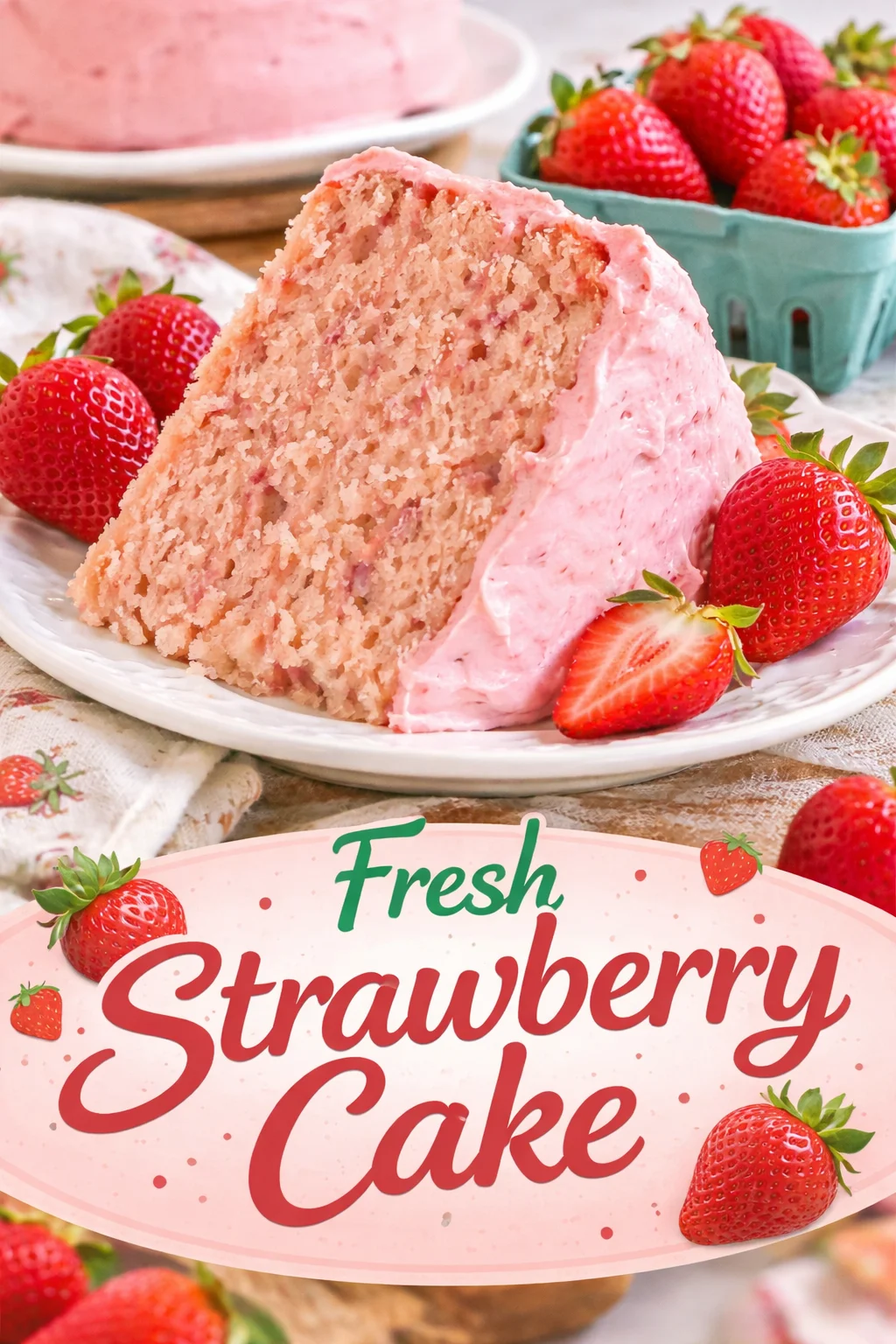 - Chill for 15 minutes, then finish with a final frosting layer and decorate with fresh strawberry halves.