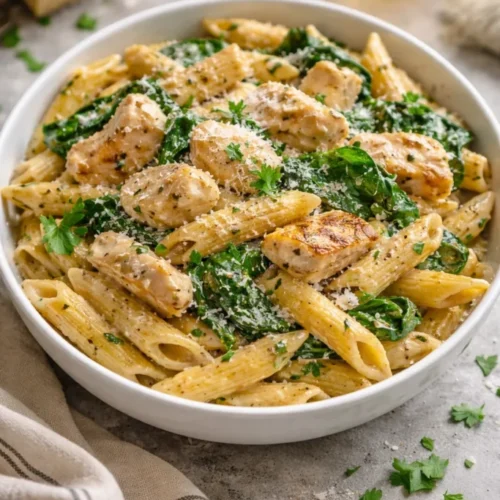 A creamy and flavorful pasta dish combining tender chicken, garlic, and Parmesan, perfect for family dinners and quick weeknight meals.