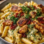 A delightful pasta dish featuring tender chicken, creamy sauce, sun-dried tomatoes, and fresh basil, perfect for family gatherings or romantic dinners.