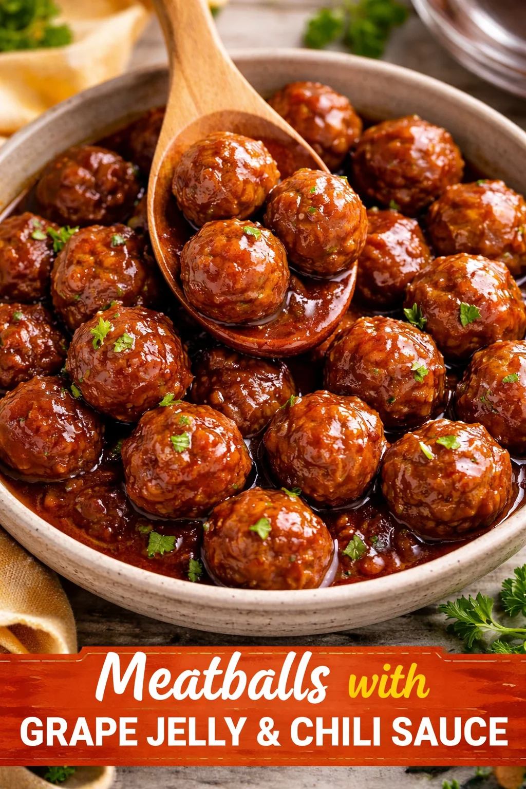 A cozy, sweet, and spicy dish that combines tender meatballs with a glossy grape jelly and chili sauce, perfect for family meals or gatherings.