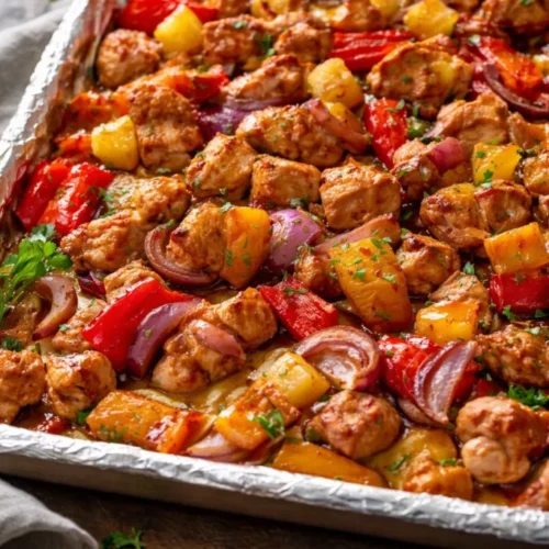 A quick and easy recipe for Sheet Pan Hawaiian Chicken featuring juicy chicken, sweet pineapple, and colorful bell peppers, perfect for busy weeknights.