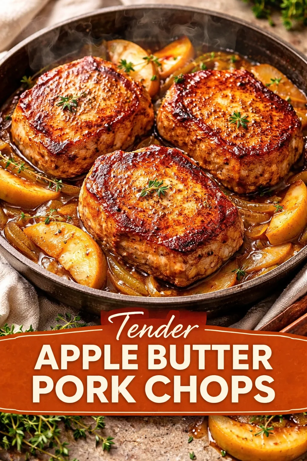 A cozy, quick family meal featuring pork chops seared to perfection and glazed with a rich, sweet apple butter sauce.