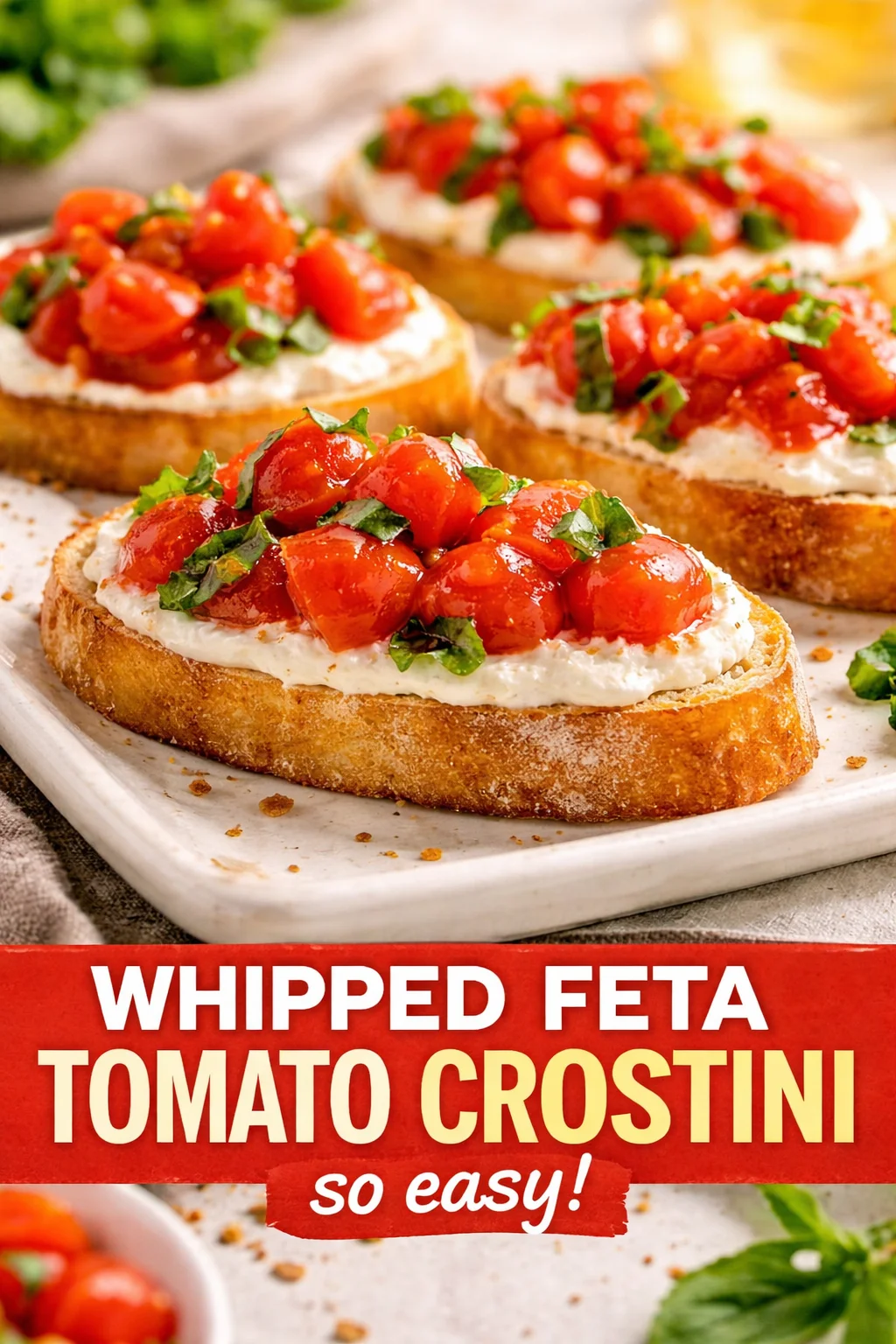 - Spread a generous smear of whipped feta on each crostini, top with roasted tomatoes, a drizzle of olive oil, fresh basil, and a pinch of flaky sea salt and red pepper flakes if using. Serve immediately so the crostini stay crisp while the whipped feta remains luxuriously creamy.